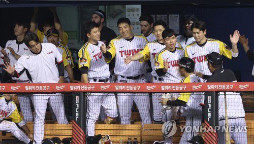 (서울=연합뉴스) 김성민 기자 = 1일 오후 서울 잠실야구장에서 열린 2023 프로야구 롯데 자이언츠와 LG 트윈스의 경기. 8회말 2사 3루 오지환 3루타 때 3루 주자 문보경이 홈을 밟은 뒤 더그아웃으로 들어가며 동료들과 기뻐하고 있다. 2023.6.1