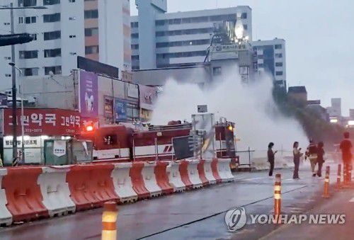 사고 현장에서는 상수도관이 파열되면서 막대한 양의 물이 분수처럼 공중으로 치솟아 도로와 인근 상가로 쏟아졌다.