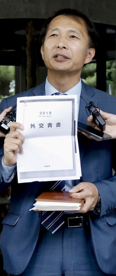일 외교청서 들고 외교부가 2015년 한·일 위안부 문제 합의와 관련한 문서를 비공개한 조치는 정당하다는 대법원 판결이 내려진 1일 송기호 변호사가 입장을 밝히고 있다. 연합뉴스 |