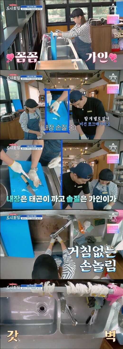 이태곤은 "내가 내장 까주면 너는 거기를 솔질을 하면 된다"라고 가르쳤다. 이어 엉망이 된 싱크대를 송가인은 거침없이 닦아냈고 도마 설거지를 비롯해 행주빨기까지 척척 정리를 했다.