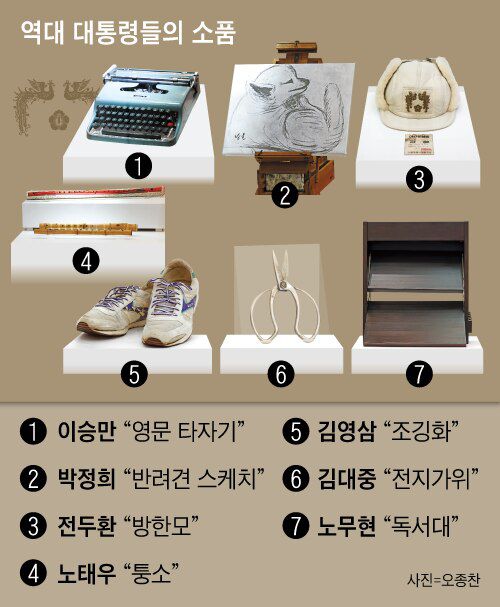 독립운동 시절부터 쓴 이승만 대통령의 영문 타자기, 박정희 대통령이 서거 직전까지 키웠던 반려견을 스케치한 그림, 김영삼 대통령의 낡은 조깅화….