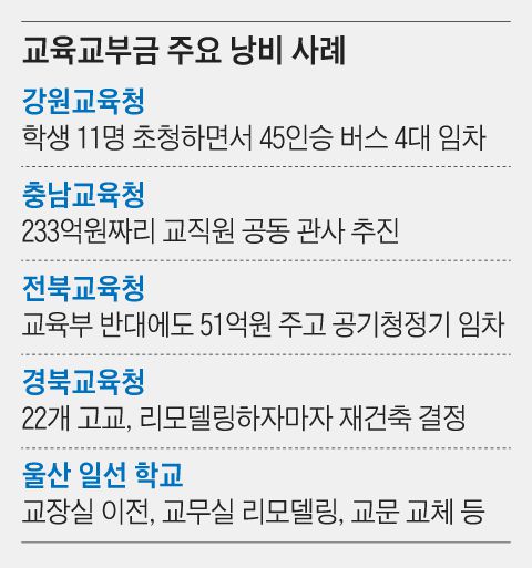 내국세의 20.79%를 무조건 시도 교육청에 나눠주는 지방교육교부금 문제점이 감사원 감사 결과 다시 한번 드러났다. 감사원은 2020∼2022년 전국 시도 교육청 교육교부금 195조1000억원의 21.8%인 42조6000억원이 불필요하게 지출됐다고 지적했다. 1년에 14조원꼴이다.