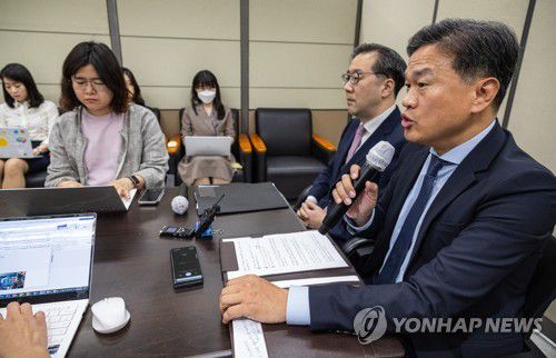 (서울=연합뉴스) 황광모 기자 = 이준일 외교부 북핵기획단장과 최현석 경찰청 사이버수사국장(오른쪽)이 2일 오전 서울 종로구 외교부에서 북한 정찰총국 산하 해커 조직 '김수키'를 독자 대북 제재 명단에 올린 것과 관련한 브리핑을 하고 있다. 김수키는 한국수력원자력, 한국항공우주산업 등을 해킹한 것을 포함해 국내 무기와 인공위성, 우주 관련 첨단기술을 절취한 유명 해킹 공작 조직이다. 2023.6.2 hkmpooh@yna.co.kr