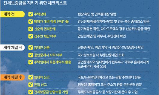 “전입신고를 통해 대항력을 갖추는 것이 중요하다. 전입신고는 주민등록법 제11조에 따른 의무사항으로 전입 후 14일 이내에 신고해야 하며, 전입신고 익일에 대항력이 발생한다. 전세보증금 반환보증에 가입하면 보증사고 발생 시 보증회사에서 보증금 반환을 대신해 책임진다. 재계약 직전이나 계약체결 이후에도 전세계약 전 확인했던 사항들을 꼼꼼히 살피고 등기내용에 변경이 있는지 확인해야 한다.”
