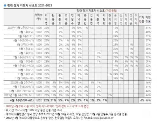 장래 지도자를 묻는 여론조사에서는 이 대표가 22%로 1위, 한 장관이 11%로 2위를 차지했다. 이어 홍준표 대구시장(5%), 오세훈 서울시장(4%), 안철수 국민의힘 의원(2%), 이낙연 전 총리(2%), 유승민 전 의원(1%), 김동연 경기도지사(1%), 이준석 전 국민의힘 대표(1%), 이탄희 민주당 의원(1%)으로 집계됐다. 이 대표와 한 장관은 지난해 9월 조사 이후 줄곧 야권과 여권의 장래 지도자 1위를 차지했다. 다만 이번 조사에서 이 대표는 2%포인트 오른 데 비해 한 장관은 지난 조사와 똑같았다.