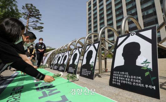 산재사망대책마련 공동캠페인단이 산업재해피해가족네트워크 ‘다시는’과 함께 지난해 4월27일 서울 종로구 현대건설 본사 앞에서 2022 최악의 살인기업 선정식을 열어 참석자들이 산재 사망자들을 추모하는 행사를 진행하고 있다. 김창길기자 |
