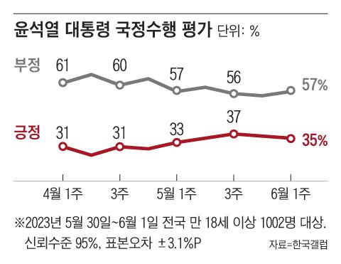 한국갤럽이 지난달 30일부터 이달 1일까지 전국 만 18세 이상 1002명을 대상으로 조사한 결과 윤석열 대통령 직무수행에 대해 35%가 긍정 평가했고 57%는 부정 평가했다. 그 외는 의견을 유보했다(어느 쪽도 아님 2%, 모름/응답거절 6%).
