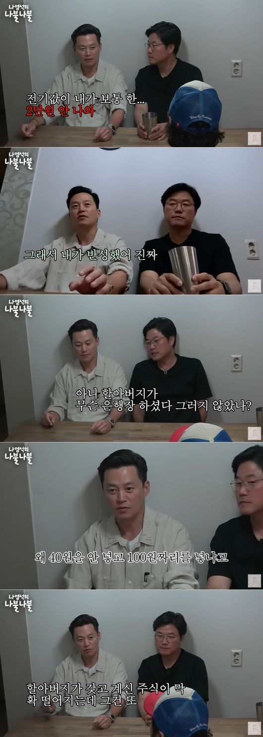 그는 "더 웃긴 건 할아버지가 갖고 계신 주식이 막 확 떨어지는데 그건 또 허허 웃고 마셨다. 주식은 몇억이 손해인데 100원짜리 넣었다고 그렇게 혼을 내시더라"라고 너스레를 떤 뒤 "전화하다가 전화기 막 뽑아가시고 그랬다. 아버지가. 전화기 안방에 넣고 잠그시더라. 형이 전화하다가 뺨 맞는 것도 봤다"라고 밝혔다.