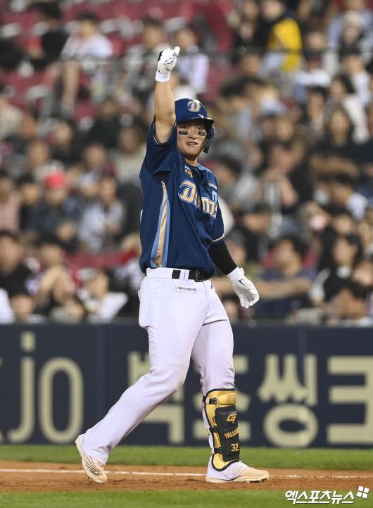 (엑스포츠뉴스 잠실, 박지영 기자) 2일 오후 서울 송파구 잠실야구장에서 열린 '2023 신한은행 SOL KBO리그' NC 다이노스와 LG 트윈스의 경기, 8회초 1사 2,3루 NC 안중열이 2타점 적시타를 때려낸 뒤 세리머니를 하고 있다.