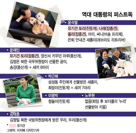 윤석열 대통령 부부가 지난달 28일 SBS 'TV 동물농장'에 출연해 스스로 소개하며 한 말이다. 실제로 두 사람은 유기견 나래, 올리, 고양이 5명까지 총 11마리의 반려동물을 키운다. 윤 대통령의 동물 사랑은 역대급이다. 과거 대통령들 다수가 '퍼스트독(대통령의 견공)'을 키웠지만 스스로를 이들의 '아빠'로 지칭하진 않았다.