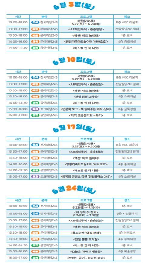 이 밖에 시민을 대상으로 하는 '책 읽어주는 여자·남자', 융복합 콘텐츠 강연 '전일245 클래스'에서는 인문학 토크와 창업을 위한 메타버스 특강이 진행된다. 라이브 공연 '버스킹 인 더 나잇'에서는 댄스 그룹 '무빙업패밀리'와 퓨전국악그룹 '그루', 팝페라그룹 '루비', 싱어송라이터 강예영 씨의 무대가 펼쳐진다.