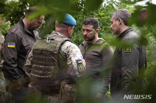 우크라이나 대통령 공보실이 제공한 사진에 볼로디미르 젤렌스키(오른쪽 두 번째) 대통령이 23일(현지시각) 도네츠크주를 방문해 군 지휘관과 얘기하고 있다. 도네츠크=AP/뉴시스 |