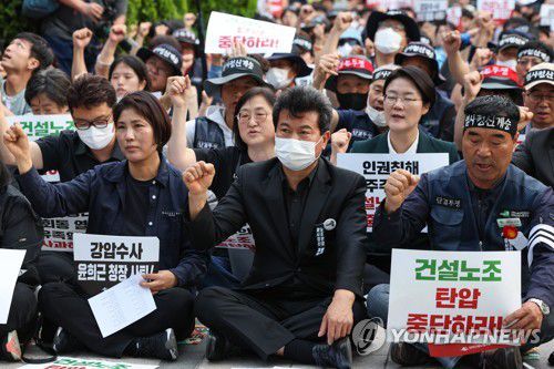 (서울=연합뉴스) 신현우 기자 = 3일 오후 서울 중구 청계광장 인근에서 열린 '양회동 열사 투쟁 노동시민사회종교문화단체 공동행동' 주최 촛불문화제에서 양회동 씨 친형 양회선 씨(가운데), 장옥기 전국건설노동조합 위원장(오른쪽) 등 참가자들이 구호를 외치고 있다. 2023.6.3