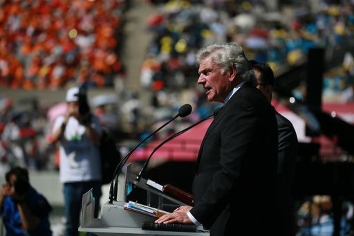 빌리 그레이엄 목사의 장남 프랭클린 그레이엄 목사가 3일 서울 마포구 서울월드컵경기장에서 열린 ‘빌리그래함 전도대회 50주년 기념대회’에 참석해 발언하고 있다. 극동방송 제공 |