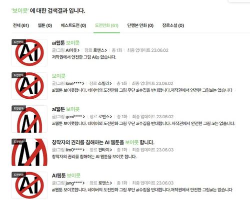 3일 오후 8시 기준으로 상위 10개 도전만화 중 7개가 'AI웹툰 보이콧'이었다. 또 인터넷 커뮤니티와 소셜미디어(SNS)에서도 보이콧 운동이 퍼지고 있다.