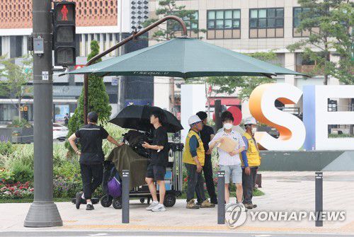 갑작스런 소나기, 그늘막으로 대피 |