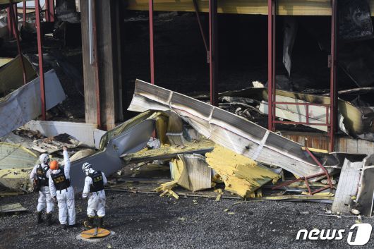 지난해 1월 10일 오전 소방관 3명이 순직한 경기도 평택 냉동창고 신축 공사장 화재현장에서 경찰과 소방, 국과수 등 관계자들이 합동감식을 하고 있다. 2022.1.10/뉴스1 ⓒ News1 김영운 기자 |
