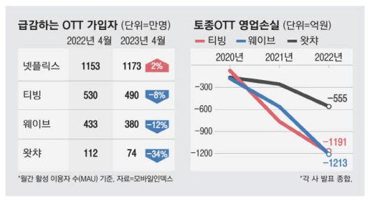 시장을 독식하고 있는 넷플릭스가 수익성을 개선하기 위해 전개하는 이른바 '마른 수건 쥐어짜기' 전략도 토종 OTT들의 수익성 악화를 부채질하고 있다. 작년 말 넷플릭스는 국내 시장에 '광고요금제'를 도입하면서 이용자가 급락한 토종 3사와 달리 오히려 이용자 수를 1년 새 2% 더 키우는 성과를 거뒀다.
