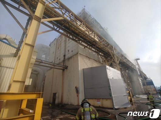 (인천=뉴스1) 박아론 기자 = 인천의 한 목재공장에서 불이 나 소방이 대응 1단계를 발령하고 진화작업을 하고 있다.
