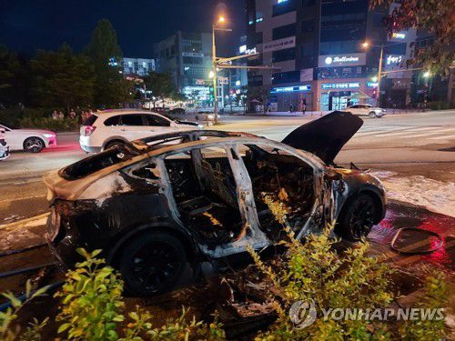 (전주=연합뉴스) 4일 오후 7시 46분께 전북 전주시 덕진구 중동의 한 도로를 주행 중이던 테슬라 전기차에서 불이 나 차량이 전소됐다. 운전자는 차에서 재빨리 대치해 큰 인명피해는 없는 것으로 알려졌다. 사진은 불이 난 차량. 2023.6.4 [전북소방본부 제공. 재판매 및 DB 금지]