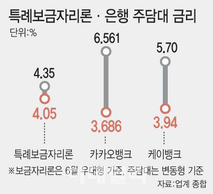 반면 시중은행 주담대는 하락 추세다. 2일 기준 카카오뱅크(323410) 주담대 금리는 고정형이 연 3.677 ~ 6.306%, 변동형이 연 3.686 ~ 6.561%다. 케이뱅크 주담대 금리는 고정형이 연 3.93~4.97%, 변동형이 연 3.94~5.70%다. KB국민·신한·하나·우리 등 4대 시중은행 주담대 금리 역시 2일 기준 고정형은 연 3.92~6.044%, 변동형이 연 3.91~6.987%로 낮아졌다. 특례보금자리론이 출시된 1월30일에 견주면 4대 시중은행 주담대 금리는 하단 기준으로 고정형은 0.21%p, 변동형은 1.13%p 떨어졌다.