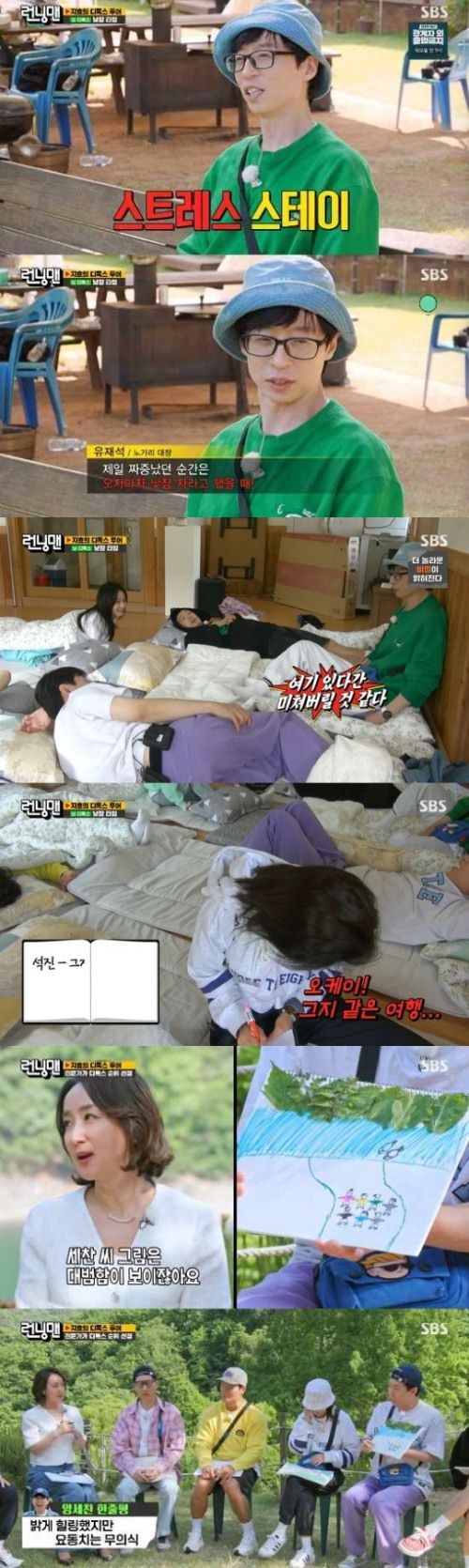 이에 제작진은 오지임을 강조하며 “아무것도 없다. 핸드폰은 송지효 씨만 사용할 수 있다”라고 전했다. 이후 ‘뇌 디톡스’ 타임으로 낮잠을 즐겨 눈길을 끌었다. 하지만 예상과 달리 낮잠 시간을 온전히 즐기지 못하는 멤버들이 있었다. 특히 유재석은 “미쳐버릴 것 같다”라며 거지 같은 여행이라고 혹평을 쏟아냈다.