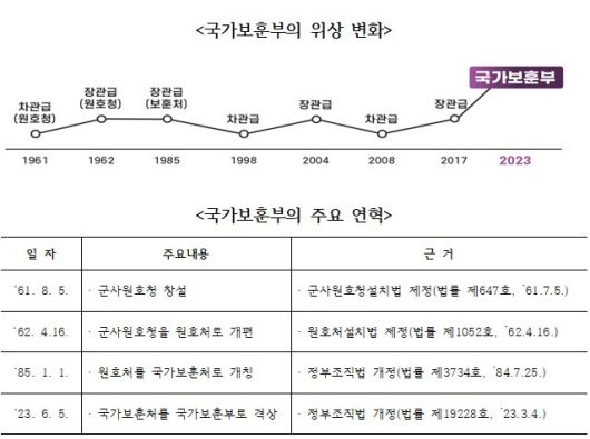 국가보훈처가 1961년 군사원호청으로 출발한 지 62년 만에 5일 국가보훈부로 공식 출범한다. 지난 2월 국회에서 국가보훈부로 승격하는 내용이 담긴 정부조직법이 개정 된 이후 3개월의 준비 기간을 거쳐 이날 초대 보훈부 장관인 박민식 장관 체제로 부가 공식 출범한다.