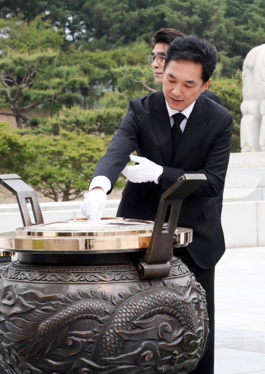 (대전=뉴스1) 김기남 기자 = 박민식 국가보훈처장이 2022년5월13일 오후 취임식에 앞서 국립대전현충원을 찾아 현충탑에 분향 하고 있다. 2022.5.13/뉴스1 |