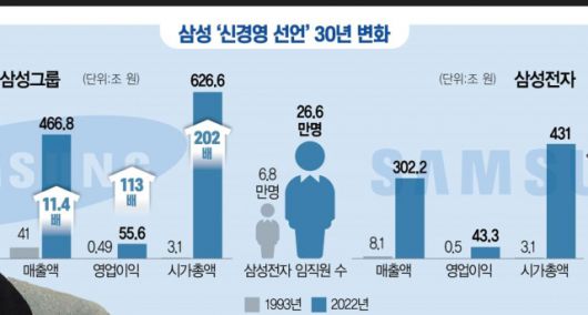 이건희 회장의 일갈과 함께 삼성은 당대에 넘볼 수 없는 일류 기업으로 성장했다. 당장 실적의 ‘단위’가 달라졌다. ‘신경영 선언’을 발표한 1993년 3조 1000억 원 수준이던 삼성그룹의 시가총액은 현재 626조 6000억 원(상장 계열사 16곳, 2일 종가 기준)으로 200배 넘게 커졌다. 매출액은 41조 원에서 466조 8000억 원으로, 영업이익은 4900억 원에서 55조 6000억 원으로 각각 성장했다.