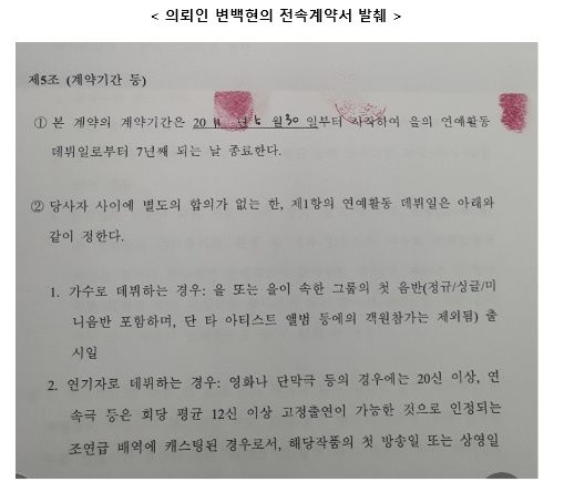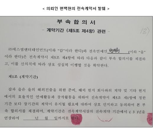 그런데 SM은 위 2007년 공정위 시정명령을 받은 이후, 2010년 및 2011년 체결한 백현, 시우민, 첸과의 전속계약에서도 정확히 동일하게 불공정한 조항을 반복하여 제시하고, 체결하게 하였습니다. (아래 의뢰인 변백현의 전속계약서 발췌)
