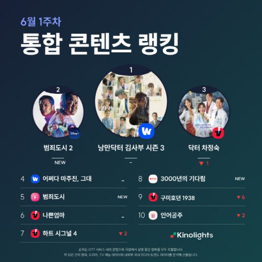인터넷 동영상 서비스(OTT) 통합검색 및 추천 플랫폼 키노라이츠의 6월 1주 차(5/25~5/31) 통합 콘텐츠 랭킹에서 [낭만닥터 김사부 시즌 3]가 1위를 차지했다.
