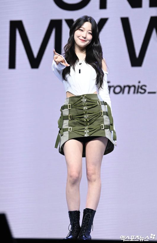(엑스포츠뉴스 박지영 기자) 5일 오후 서울 광장동 예스24라이브홀에서 그룹 프로미스나인(fromis_9) 첫 번째 정규 앨범 '언록 마이 월드(Unlock My World)' 발매 기념 쇼케이스가 열렸다. 이날 쇼케이스에 참석한 프로미스나인 백지헌이 포토타임을 갖고 있다. 박지영 기자 jypark@xportsnews.com