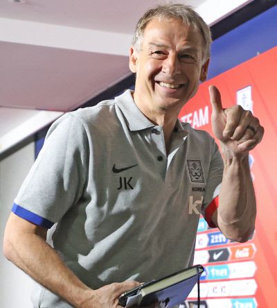 위르겐 클린스만 축구대표팀 감독이 5일 서울 종로구 축구회관에서 페루·엘살바도르 상대 평가전 대표 선수 명단을 발표한 뒤 엄지손가락을 치켜세우며 회견장을 나서고 있다. 연합뉴스