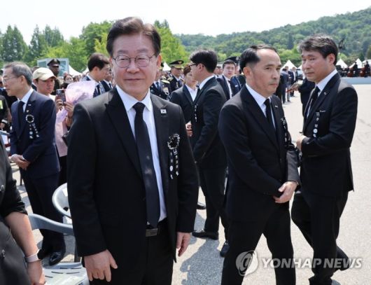 이재명 더불어민주당 대표(왼쪽)가 6일 서울 동작구 국립서울현충원에서 열린 제68회 현충일 추념식장에서 최원일 전 천안함장(가운데)으로부터 항의를 받은 뒤 돌아서고 있다. 연합뉴스 |