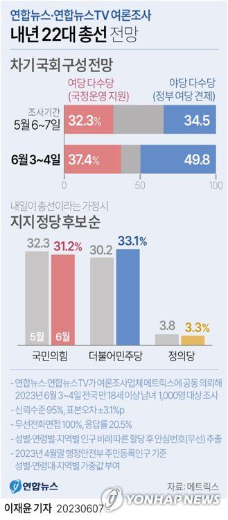 연합뉴스와 연합뉴스TV가 공동으로 여론조사기관 메트릭스에 의뢰해 지난 3∼4일 전국 만 18세 이상 성인 남녀 1천명을 대상으로 실시한 '월례 정치여론조사' 결과, 내일이 국회의원 선거일이라면 민주당 후보에게 투표하겠다는 응답은 33.1%로 나타났다.