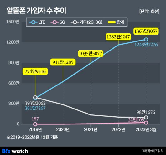 알뜰폰 이용자가 지난 1월 1300만명을 넘어섰지만 5G 이용자 비중은 1%(3월 기준, 1.6%) 수준에 불과하다. 가격에 민감한 알뜰폰 이용자 특성상 비싼 5G 요금제를 이용하기보다는 LTE를 이용하는 소비자가 많기 때문이다.