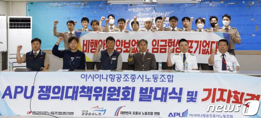 (서울=뉴스1) 김도우 기자 = 아시아나항공조종사노동조합 조합원들과 민주노총 공공운수노조 조합원들이 7일 서울 중구 민주노총 중회의실에서 열린 아시아나항공조종사노동조합 쟁의대책위원회 발대식 및 기자회견에서 구호를 외치고 있다. 2023.6.7/뉴스1pizza@news1.krCopyright ⓒ 뉴스1. All rights reserved. 무단 전재 및 재배포 금지.