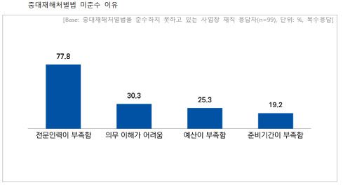 특히 작년 1월 27일부터 이미 중대재해처벌법 적용을 받고 있는 50인 이상 중소기업의 경우, 절반 이상(50.4%)이 중대재해처벌법 시행 이후 안전 관련 예산·인력을 확대했지만 셋 중 하나(34.8%)는 여전히 의무사항을 준수하지 못하고 있었다. 그 이유로는 ‘전문인력 부족’(77.8%)이 가장 많은 응답을 차지했다.