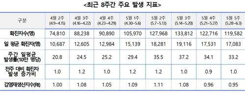 5월 5주 일평균 신규 확진자 수는 1만7천83명으로, 전주 1만7천531명보다 448명 줄었다.