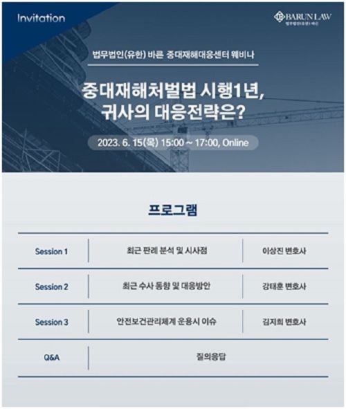 웨비나는 오후 3시부터 총 3개 세션으로 나뉘어 유튜브로 생중계된다. 바른 중대재해대응센터장을 맡고 있는 이상진 변호사(30기)가 ‘최근 판례 분석 및 시사점’을, 강태훈 변호사(36기)가 ‘최근 수사 동향 및 대응방안’을 주제로 발표한다. 이어 김지희 변호사(변시 1회)가 ‘안전보건관리체계 운용시 이슈’를 주제로 발표한다. 주제 발표 후 질의응답 시간도 주어진다.