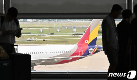 (인천공항=뉴스1) 김진환 기자 = 아시아나항공 조종사노동조합이 7일 서울 중구 민주노총 본부에서 쟁의대책위원회 발대식을 열고 오늘 오전 10시부터 사측의 성실한 임금협상을 요구하며 무기한 준법투쟁에 돌입했다고 밝혔다. 노조는 이륙 약 2시간 전에 시작했던 조종사·승무원 브리핑을 규정대로 이륙 1시간 20분 전에 진행하고 항공기가 활주로를 달릴 때 법정 속도를 준수할 계획이다. 이에 따라 항공기 출발이 최소 30분 이상 늦어질 수 있다. 사진은 이날 오후 인천국제공항 제1터미널에 세워져 있는 아시아나항공 여객기. 2023.6.7/뉴스1