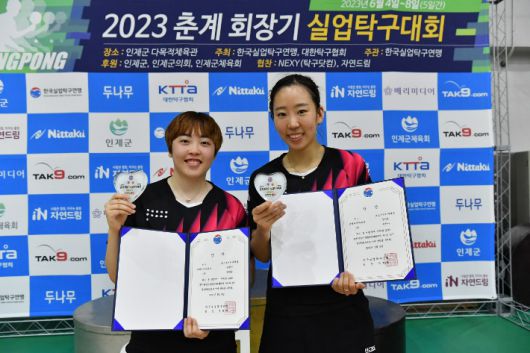 포스코인터내셔널 양하은(오른쪽)이 7일 '2023 춘계회장기 실업탁구대회' 여자 복식에서 소속팀 후배 유한나와 함께 우승을 합작한 뒤 포즈를 취하고 있다. 포스코인터내셔널 |