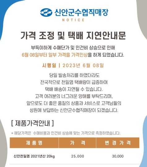 8일 신안군수협직매장은 이날부터 '신안천일염 2021년산 20kg' 가격을 2만5000원에서 3만원으로 올린다고 공지했다. 수매단가 및 인건비 상승을 이유로 들며 "전국적으로 천일염 택배량이 급증해 택배 배송이 지연될 수 있다"고 설명했다. 신안군 염전은 전국 천일염 생산량의 85%를 차지한다.