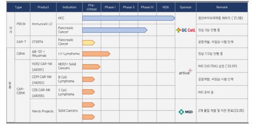 지씨셀은 비(B) 세포 림프종과 티 세포 림프종이 적응증인 키메라 항원 수용체 자연살상 세포치료제 ‘AB-202’, ‘AB-205’의 임상 1상도 앞두고 있다. 지씨셀은 아티바에 △‘AB-201’ △‘AB-101’ △‘AB-202’ △‘AB-205’ 등 4종의 파이프라인을 기술 수출했다.