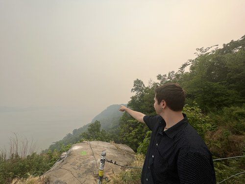(뉴욕=연합뉴스) 고일환 특파원 = 조셉(23) 씨가 연무에 휩싸인 미국 뉴욕 맨해튼을 손가락으로 가리키고 있다. 2023.6.8 koman@yna.co.kr ▶제보는 카카오톡 okjebo▶연합뉴스 앱 지금 바로 다운받기~▶네이버 연합뉴스 채널 구독하기 <저작권자(c)연합뉴스. 무단전재-재배포금지.>