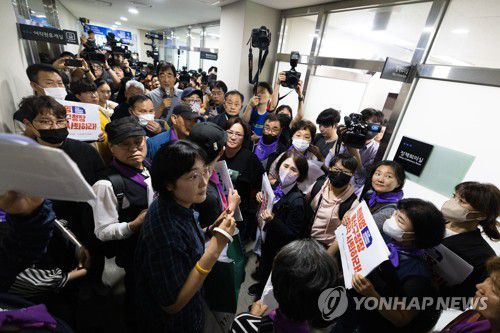 (서울=연합뉴스) 김인철 기자 = 8일 오전 서울 용산구청에서 이태원 참사 유가족들이 이태원 참사 부실 대응 혐의로 구속기소 됐다 보석으로 석방된 박희영 용산구청장의 출근을 저지하기 위해 구청장실 앞에서 대기하고 있다. 2023.6.8 [공동취재]