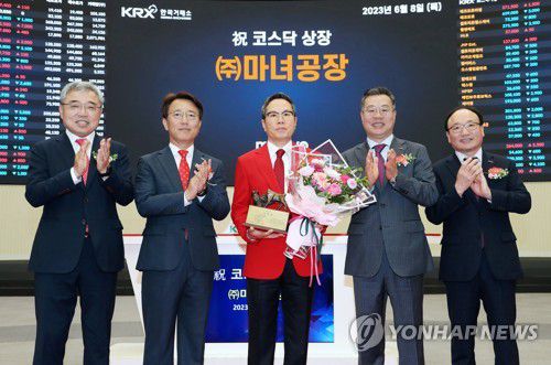 (서울=연합뉴스) 8일 서울 영등포구 한국거래소에서 열린 에서 관계자들이 상장기념패 전달 후 기념 촬영하고 있다. 왼쪽부터 채남기 한국IR협의회 회장, 이부연 한국거래소 코스닥시장본부장보, 유근직 (주)마녀공장 대표이사, 정일문 한국투자증권 대표이사, 강왕락 코스닥협회 부회장. 2023.6.8 [한국거래소 제공. 재판매 및 DB 금지]