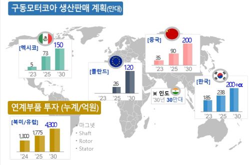 현재 국내에는 천안과 포항에 구동모터코아 200만대 생산체제를 구축해 친환경차 모터 시장의 폭발적인 수요 증가에 대비하고 있다. 전기차 시장의 무역장벽 리스크를 해소하고 완성차 업체들의 현지조달 수요를 충족하기 위해 각 대륙 거점인 중국, 멕시코, 폴란드, 인도 등에 2030년까지 500만대 구동모터코아 해외 생산체계도 구축 중이다.