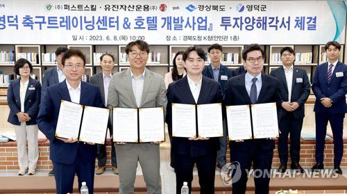 (안동=연합뉴스) 경북도와 영덕군, 퍼스트스킬, 유진자산운용이 8일 도청에서 '영덕 축구트레이닝센터 및 호텔 개발사업'을 위한 업무협약을 하고 있다. 2023.6.8 [경북도 제공. 재판매 및 DB 금지] haru@yna.co.kr ▶제보는 카카오톡 okjebo▶연합뉴스 앱 지금 바로 다운받기~▶네이버 연합뉴스 채널 구독하기 <저작권자(c)연합뉴스. 무단전재-재배포금지.>
