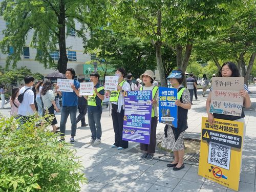 (광주=연합뉴스) 천정인 기자 = 일본 방사성오염수 해양투기저지 광주전남공동행동은 8일 국제해양의 날을 맞아 광주 북구 전남대학교 후문에서 후쿠시마 원전 오염수 투기 현황과 문제점을 알리는 캠페인을 벌였다.